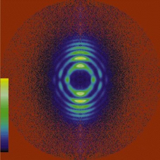 Bildspektrometer 2: Photoelektronenspektrum von Xenon, aufgenommen mit einem Bildspektrometer. Jedem der konzentrischen Ringe entspricht eine Elektronenenergie. Die Struktur der einzelnen Ringe zeigt die Winkelverteilung der Photoelektronenemission. (Messung: V. Schyja, H. Helm, Univ. Freiburg).