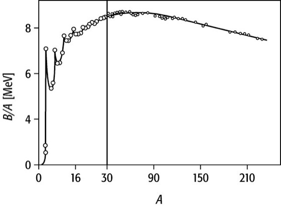 Interessante Folgerungen ergeben sich aus der Betrachtung der Bindungsenergie pro Nukleon B/A, die der mittleren Energie entspricht, die aufgebracht werden muß, um ein einziges Nukleon vom Kern zu separieren (Abb. 1). Für leichte Kerne zeigt B/A erhebliche Schwankungen. So hat das Deuteron mit 1,11 MeV eine besonders niedrige und der Helium-Kern (Alpha-Teilchen) mit 7 MeV eine besonders hohe Bindungsenergie. Im Bereich der leichten Kerne sind die Bindungsenergien für