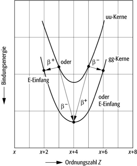 Zur Beschreibung der Abhängigkeit des Massendefekts bzw. der Bindungsenergie der Kerne von der Massenzahl wurden einige semiempirische Formeln entwickelt, deren beste die im Rahmen des Tröpfchenmodells entwickelte Bethe-Weizsäcker-Formel ist. Die Bindungsenergien der Kerne unterscheiden sich für gg-, gu-, ug- und uu-Kerne. Abb. 2 zeigt den Verlauf für uu- und gg-Kerne bei konstantem A, d.h. für Isobare. Wegen des halbzahligen Spins der Nukleonen wird ein paariges Proton oder Neutron fester gebunden als ein unpaariges. Daher ist die Bindungsenergie der gg-Kerne größer als die der uu-Kerne. Im gezeigten Beispiel existieren drei stabile gg-Kerne und kein stabiler uu-Kern. Die instabilen Kerne zeigen β - -Zerfall (Elektronenemission β - und Positronenemission β bzw. Elektronen- oder e - -Einfang). Solche Betrachtungen der Bindungsenergien der Kerne führen zu den Isobarenregeln. Das Tal der Energiefläche (Energietal) verläuft wellenförmig. Die Abweichungen vom ausgeglichenen mittleren Verlauf treten an den magischen Zahlen auf; ihre Entdeckung trug zur Entwicklung des Schalenmodells der Kerne bei.