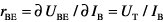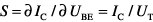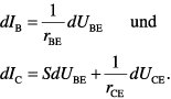 bei konstanter UCE (Steigung der ÜbertragungskennlinieIC = f(UBE)). S ≈ 40 mA/V, IC in mA. Mit diesen Abhängigkeiten und unter Vernachlässigung der Rückwirkung (IB ist unabhängig von UCE) folgen die Transistorgleichungen für den Kleinsignalbetrieb: