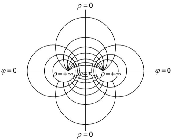 definiert. Die Kurvenscharen ϕ = const. ergeben Kreise durch die singulären Punkte A und B, während die Kurvenscharen ρ = const. ebenfalls Kreise sind, die die Strecke AB in harmonischem Verhältnis teilen (Abb.). Bipolarkoordinaten werden bisweilen in der Hydrodynamik eingesetzt; allgemein ist ihre Verwendung in der mathematischen Physik eher selten, was vor allem daran liegt, daß sich die Schwingungsgleichung in ihnen nicht separieren läßt.