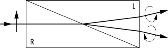 Biprisma 1: Das mit R bzw. L bezeichnete Dreieck stellt einen prismatischen Rechts- bzw. Linksquarz dar, mit deren Hilfe das ursprüngliche, linear polarisierte Licht in zwei entgegengesetzt zirkular polarisierte Teile aufgespalten wird.