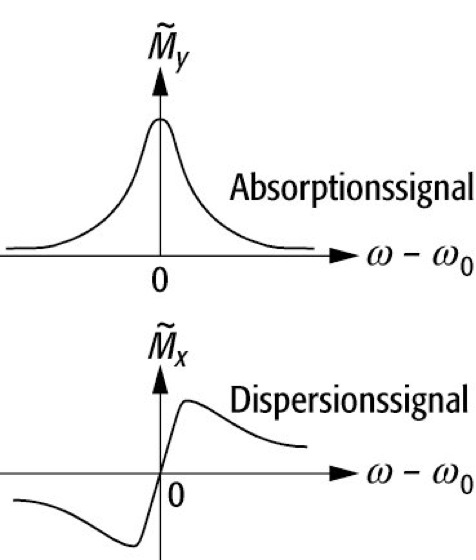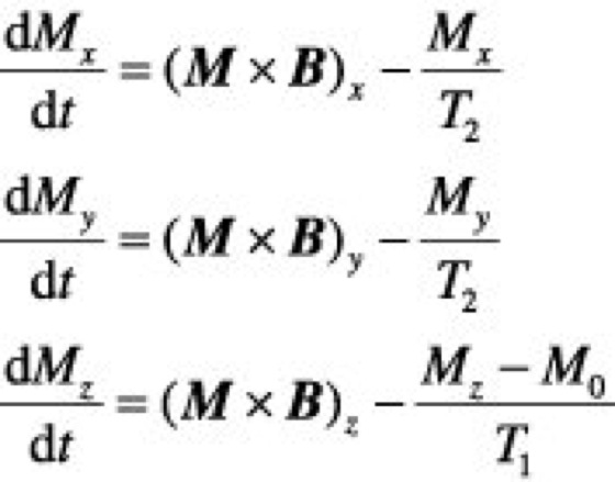 M ist die gesamte Kern- bzw. Elektronenmagnetisierung der Probe unter dem Einfluß des Magnetfeldes B. Bei magnetischen Resonanzexperimenten besteht B aus einem starken homogenen Magnetfeld B0 in z-Richtung und einem senkrecht dazu in x-Richtung angelegten, hochfrequenten magnetischen Feld BHF = 2B1cosωt. Dabei ist B = ex2B1cosωt + ezB0, und B1B0. γ ist das gyromagnetische Verhältnis der Atomkerne bzw. der Elektronen. T1 ist die longitudinale oder Spin-Gitter-Relaxationszeit, d.h. die Zeitkonstante, mit der die Magnetisierung in z-Richtung ihrem Gleichgewichtswert M0 = χ0H zustrebt (B0 = μH). T2, die transversale oder Spin-Spin-Relaxationszeit, ist entsprechend die Zeitkonstante für die x- und y-Komponenten, wobei hier der Gleichgewichtswert null ist. Sie wird durch Spin-Spin-, Spin-Gitter-Wechselwirkungen und Inhomogenitäten des äußeren Magnetfeldes B0 bestimmt.