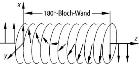 (J: Austauschintegral, K: Anisotropiekonstante, a: Gitterkonstante). In Eisen erstreckt sich eine Bloch-Wand etwa über 300 Gitterebenen.