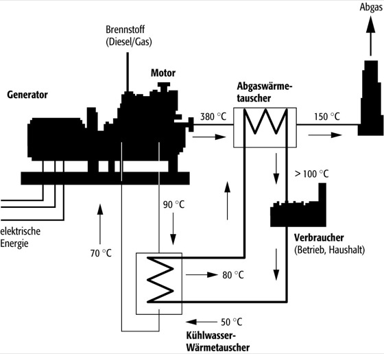 Blockheizkraftwerk: Schema der kombinierten Strom- und Wärmeerzeugung in einem Blockheizkraftwerk. Sowohl das Kühlwasser des Motors als auch die Abgase können zur Wärmeerzeugung genutzt werden.