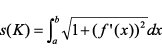 Bogenlänge, die Länge s(K), einer ebenen Kurve, die man dem Graphen K einer stetig differenzierbaren Funktion f(x) zwischen den beiden Ordinatenwerten a und b zuordnen kann: