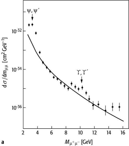 Bottomonium 1: Erster experimenteller Beweis für die Existenz der Resonanzen Υ, Υ′ durch Herb et al. (1977) aus dem Spektrum von Myonpaaren am Fermilab in Chicago. Die individuellen Zustände Υ, Υ′ etc. konnten hier nicht aufgelöst werden.