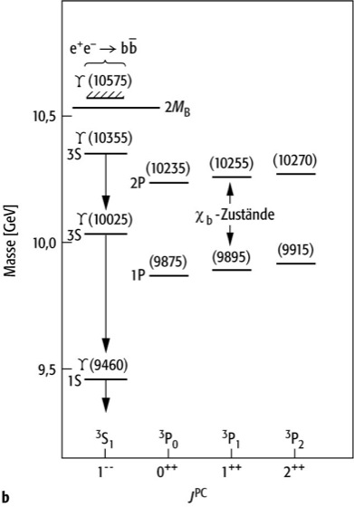 weitere Teilchen entdeckt. Später kamen weitere Υ-Resonanzen sowie andere Spin-Kombinationen hinzu, die sich mit ihren Übergängen in ein Termschema eintragen lassen (Abb.). Das Υ(4S) liegt energetisch bereits oberhalb der