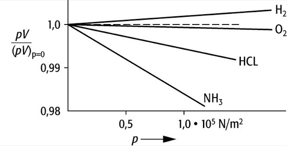 (Abb.). Dabei ist p der Druck, V das Volumen und T die Temperatur. Reale Gase genügen diesem Gesetz um so besser, je eher das Eigenvolumen der Gasmoleküle vernachlässigt werden kann, je höher also die Temperatur T und je geringer der Druck p ist. Die Abweichungen vom idealen Verhalten können bei hohen Drücken beträchtlich werden. Viele reale Gase, z.B. Luft und Wasserstoff, gehorchen dem Boyle-Mariotteschem Gesetz unter normalen Bedingungen sehr gut. Die Größe