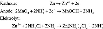Braunsteinzelle, Braunsteinelement, Leclanché-Element, das wichtigste galvanische Primärelement, es wird jährlich in Milliardenstückzahl (z.B. als Taschenlampenbatterie) produziert. Die Braunsteinzelle wurde 1866/67 von G. Leclanché erfunden und 1896 von P. Schmidt durch Einbringen von Stärke oder Mehl in den Elektrolyten zum Trockenelement weiterentwickelt. Die Anode besteht aus Zink, die mit einer Braunsteinschicht als Depolarisator umgebene Kathode aus Kohle und Braunstein (MnO2). Statt mit Stärke wird der Elektrolyt heute entweder mit Kleister vermischt oder aufgesogen in einer Papierschicht angebracht. Er besteht meist aus Ammoniumchlorid, NH4Cl, die Zelle ist dann preiswert und für kleine Entladeströme geeignet. ZnCl2 als Elektrolyt ist teurer, erhöht aber die Belastbarkeit und Lecksicherheit. Der Elektrolyt ist, anders als bei den meisten galvanischen Elementen, selbst an der Entladereaktion beteiligt. Im einzelnen finden die folgenden Reaktionen statt: