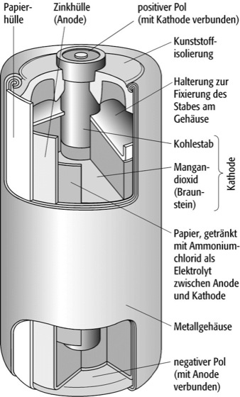 Braunsteinzelle: Aufbau einer Trockenbatterie als 1,5-V-Braunsteinzelle.