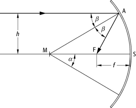Brennspiegel: Parallel zur Hauptachse einfallende Strahlen werden im Brennpunkt F vereinigt, dessen Abstand f vom Scheitelpunkt S als Brennweite bezeichnet wird. M ist der Krümmungsmittelpunkt des Brennspiegels.