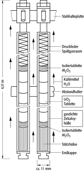 Die aus Urandioxid UO2 gepreßten, gesinterten und geschliffenen Tabletten – auch Pellets genannt – sind in die mit einer Endkappe verschlossenen Brennstäbe eingebracht. Eine Schraubenfeder drückt von oben auf die Pellets und hält sie in einer Säule fest zusammen. Dadurch wird gleichzeitig oberhalb des Kernbrennstoffs ein Raum für die bei der Kernspaltung entstehenden Edelgase und die leicht flüchtigen Spaltprodukte (Halogene) geschaffen. Der Spaltgasraum verhindert ein unzulässiges Anwachsen des Gasdrucks im Brennstoff bei der sehr starken Erwärmung.