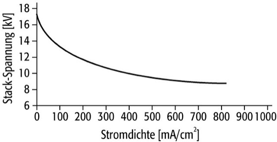 Brennstoffzelle 2: Klemmenspannung in Abhängigkeit von der Stromdichte bei einer leistungsstarken Hochtemperatur-Brennstoffzelle mit dem typischen schnellen Abfall bei niedrigen Stromdichten und einem fast linearen Verlauf bei höheren.