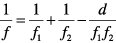 Ein Linsensystem bestehend aus zwei Linsen mit den Brennweiten f1 und f2 sowie dem Abstand d hat die Gesamtbrennweite f: