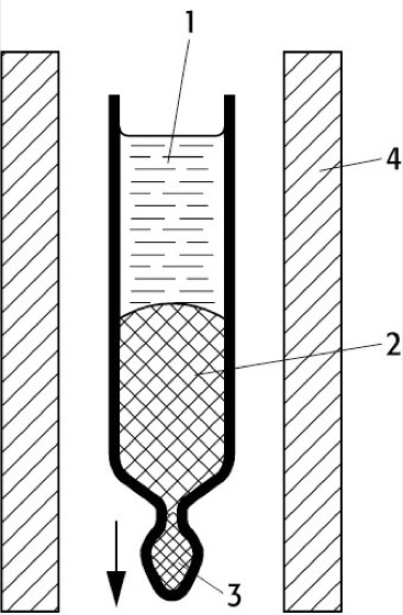 Bridgman-Verfahren: Einkristallzüchtung nach dem Bridgman-Verfahren. 1) Tiegel mit Schmelz; 2) wachsender Kristall; 3) Ansatz zur Keimbildung; 4) Heizvorrichtung.