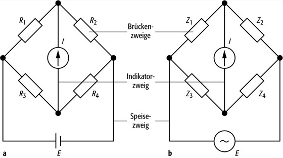 Brückenschaltung: a) Wheatstone-Brücke für Gleichstrom; b) allgemeine Wechselstrombrücke.