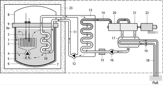 Brutreaktor: Schematischer Aufbau. 1) Brennelemente (Spaltzone); 2) Brennelemente (Brutzone); 3) Steuerstäbe; 4) Primärnatriumpumpe; 5) Primärnatrium für Primärnatriumkreislauf; 6) Reaktortank (rostfreier Stahl); 7) Sicherheitstank; 8) Reaktorkuppel; 9) Deckel; 9 a) Schutzgasatmosphäre (Argon); 10) Zwischenwärmetauscher (im Kraftwerk vier vorhanden); 11) Sekundärnatriumkreislauf; 12) Sekundärnatriumpumpe; 13) Dampferzeuger (im Kraftwerk vier vorhanden); 14) Frischdampf; 15) Vorwärmanlage; 16) Speisewasserpumpe; 17) Kondensator; 18) Flußwasser/Kühlwasser 19) Kühlwasserpumpe; 20) Hochdruckteil der Turbine; 21) Niederdruckteil der Turbine; 22) Generator; 23) Reaktorgebäude.