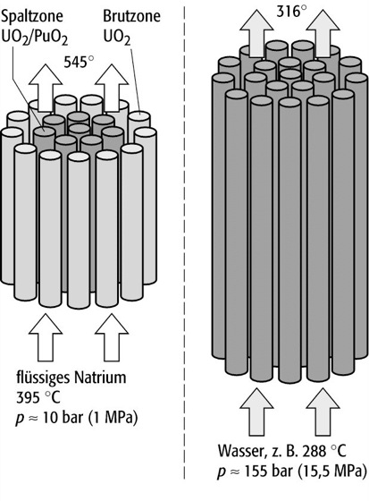 Brutzone: Reaktorkerne beim schnellen Brüter (links) und bei einem Leichtwasserreaktor (DWR) (rechts). Die Absorber- und Reflektorelemente sind nicht dargestellt.
