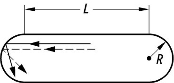 Bunimowitsch-Stadion: Die reflektierenden Wände des Bunimowitsch-Stadions bestehen aus zwei gegenüberliegenden Halbkreisen mit Radius R, die mit Liniensegmenten der Länge L verbunden sind. Für L ≠ 0 ist das System völlig chaotisch.