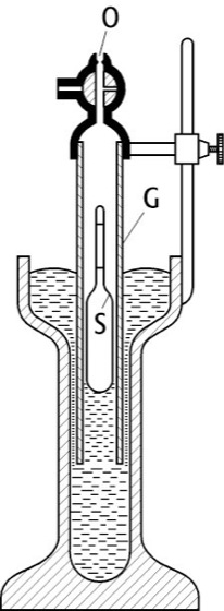 Bunsen-Effusiometer: G: unten offenes Glasrohr, S: Schwimmer, O: Öffnung.