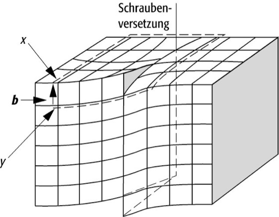 Burgers-Vektor: Der Burgers-Vektor b schließt den Umlauf um eine Schraubenversetzung.