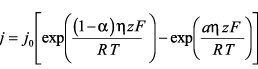 mit der (Netto-)Stromdichte j, der Austauschstromdichte j0, dem Übergangskoeffizientenα, der Überspannung η, der Anzahl der pro Formelumsatz übertragenen Elektronen z, der Faraday-Konstanten F und der allgemeinen Gaskonstanten R. Für den Grenzfall kleiner Überspannungen erhält man j = j0ηz F/R T, d.h. die Grenzfläche verhält sich wie ein ohmscher Leiter. Bei großen positiven Überspannungen (anodischer Grenzfall) ergibt sich j = j0 {exp[(1 – α) ηz F/R T]}, große negative Überspannungen (Elektrode als Kathode) führen zu j = j0 {exp[ – αηz F/R T]}.