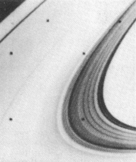 Cassinische Teilung: Voyager-1-Aufnahme der Cassinischen Teilung, die als das Gebiet zwischen den beiden schmalen dunklen Ringen definiert ist. Zu erkennen sind ein mäßig heller Ring von 800km Breite, vier hellere Ringe von etwa 500km Breite, die durch dunkle Zwischenräume getrennt sind, sowie ein heller aber kaum sichtbarer Ring von etwa 100km Breite.