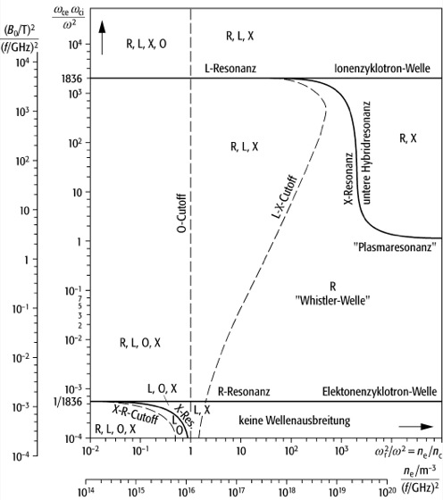 CMA-Diagramm, nach Clemmow, Mullaly und Allis benannte Art, die Existenzbereiche elektromagnetischer Wellen in einem magnetisierten Plasma darzustellen. Bei gegebener Wellenfrequenz werden in die durch Magnetfeld und Elektronendichte aufgespannte Ebene für die Grundwellentypen O, X, R und L Cut-off-Linien (Brechungsindex n = 0) und Resonanzlinien (Brechungsindex n = ∞ ) eingezeichnet. In den dazwischenliegenden Bereichen ist die jeweilige Welle ausbreitungsfähig.