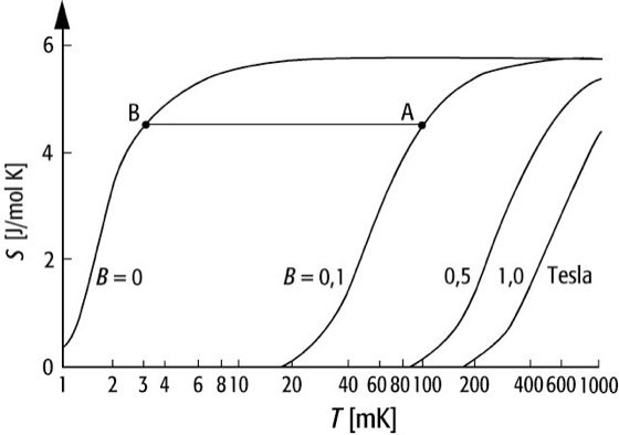 CMN:T-S-Diagramm der isentropen Kühlung mit Hilfe des paramagnetischen Salzes CMN durch Reduktion eines äußeren Magnetfeldes. Die Demagnetisierung von 0,1T auf 0T entlang der Linie A-B reduziert die Temperatur von 100mK auf 0,3mK (logarithmische Temperatur-Skala).