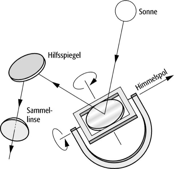 Coelostat: Durch Drehen eines Hilfsspiegels um eine horizontale Achse wird der Coelostat auf Himmelskörper mit verschiedener Deklination eingestellt.