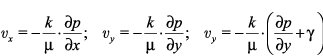 (Darcy-Gesetz), wobei k die nur von dem porösen Medium abhängige Durchlässigkeit (Wasserleitfähigkeit) p den Druck in der Flüssigkeit, η die Viskosität der strömenden Flüssigkeit und γ ihr spezifisches Gewicht darstellt. Mit dem Darcy-Gesetz läßt sich die Strömung von Bodenwasser und Grundwasser beschreiben.