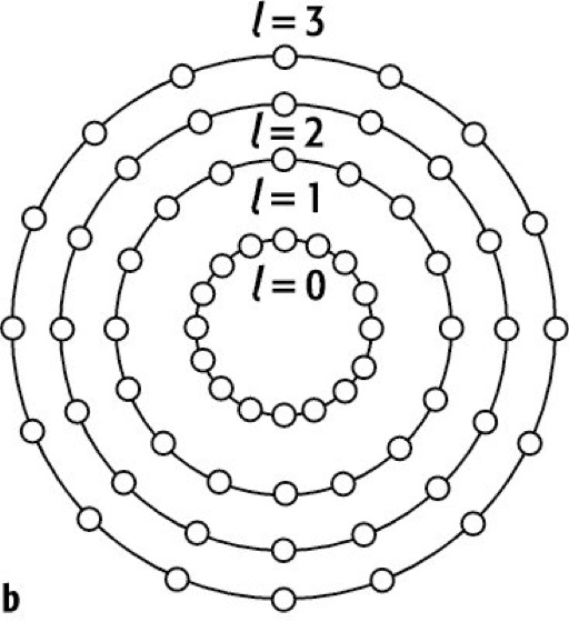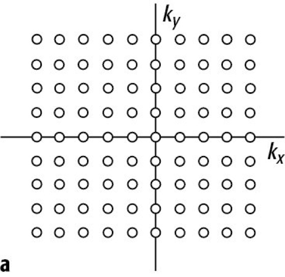 De-Haas-van-Alphen-Effekt: Elektronenzustände in der kxky-Ebene: a) ohne externes Magnetfeld und b) auf den Landau-Zylindern in einem Magnetfeld.