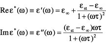 ist die statische Dielektrizitätskonstante, und ε0 ist die Dielektrizitätskonstante des Vakuums. Dieser Ansatz führt zu den Debye-Gleichungen für die Frequenzabhängigkeit der komplexen Dielektrizitätskonstantenε*(ω) im Frequenzbereich der Orientierungspolarisation: