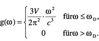 das Volumen einer Kugelschale zwischen den Oberflächen k und k + dk; der Faktor 3 berücksichtigt die drei Zweige. Mit ω = c · k ergibt sich g(ω) zu