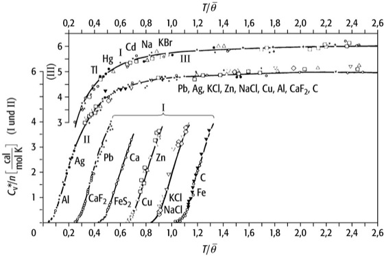 Unterscheidet man die Beiträge, welche von den einzelnen akustischen Zweigen (transversale und longitudinale) zur spezifischen Wärmekapazität geliefert werden, so kann man ihnen im Modell des isotropen Kontinuums eigene Debye-Temperaturen θp (mit p = 1, 2, 3) zuordnen. Die optischen Schwingungen, die im Phononenspektrum als Peaks sichtbar werden, können durch eine δ-förmige Frequenzverteilung der Gitterschwingungen angenähert werden. Anisotrope Kristallstrukturen können approximativ durch richtungsabhängige Debye-Temperaturen erfaßt werden. Schwierigkeiten des Debyeschen Modells, dem eine Kontinuumsvorstellung des Festkörpers zugrunde liegt, werden erst durch ein quantenmechanisches Herangehen überwunden. [GR1, HW1]