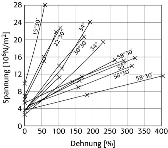 Dehnungskurve, die Darstellung der bei einem Dehnungsversuch auftretenden plastischen Dehnung in Abhängigkeit von der Spannung (Dehnung, Deformationen). Die elastische Dehnung bleibt also – im Gegensatz zum gewöhnlichen Spannungs-Dehnungs-Diagramm – unberücksichtigt. Die Dehnungen von Einkristallen zeigen eine starke Abhängigkeit von der Ausgangsorientierung und damit eine große Streuung untereinander (Abb.). Um die Betrachtungen besser den physikalischen Vorgängen anzupassen, werden bei Einkristalluntersuchungen statt der Dehnungskurve die Verfestigungskurven, d.h. die Abhängigkeit der Schubspannung von der Abgleitung, betrachtet.