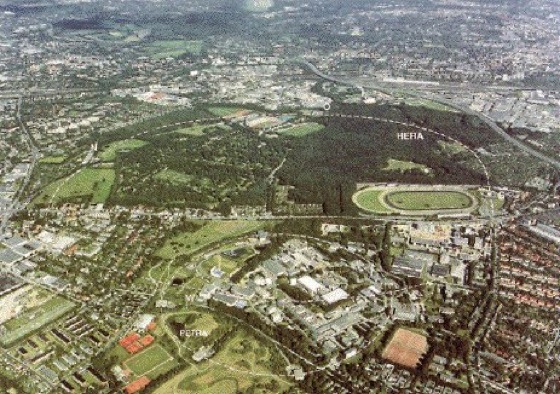 Das DESY betreibt mehrere Beschleuniger, wobei ältere Geräte als Vorbeschleuniger für die Synchrotrons DORIS III (1990, 4, 5 GeV) und PETRA II (1978, 12 GeV) und den Hadron-Elektron-Speicherring HERA (1990, 30GeV (e + e - ), 820 GeV (p)) dienen (Abb. 1 und Abb. 2). HERA widmet sich vor allem Untersuchungen zum Quark-und-Gluon-Inhalt und zum Spin von Protonen und Neutronen. Letztere Experimente, bei denen mit polarisierten Elektronen- und Targetstrahlen gearbeitet wird, laufen unter dem Namen HERMES. Die beiden wichtigsten Detektoren bei HERA sind der H1- und der ZEUS-Detektor. Mit dem ursprünglichen Elektron-Positron-Speicherring DORIS und dem ARGUS-Detektor gelangen in der Zeit von 1978 bis 1993 einige wichtige Entdeckungen: der Nachweis der Umwandlung des Bottom-Quarks in andere Quarks (Charm-, Up- und Top-Quark – letzteres indirekt), die damals weltweit beste Bestimmung der Masse des Tau-Neutrinos sowie der Nachweis von angeregten Charm-Mesonen und Charm-Baryonen. DORIS III wird seit 1993 ausschließlich als Synchrotronstrahlungsquelle betrieben und bildet das Herzstück des HASYLAB (Hamburger Synchrotron-Laboratorium, 1981 gegründet). Die Synchrotronstrahlungsexperimente reichen von physikalisch/technischen Grundlagenfragen (z.B. Freie-Elektronen-Laser) über die Materialforschung bis zur biomedizinischen Forschung. PETRA arbeitet nicht nur als letzte Vorstufe für HERA, sondern seit der Inbetriebnahme eines Undulators 1995 auch als Quelle für harte Röntgenstrahlung hoher Kohärenz (Röntgenlaser).