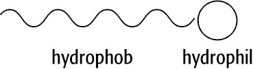 Detergenzien: Die Senkung der Oberflächenspannung basiert auf der Molekülstruktur: ein hydrophober Schwanz (meist langkettige Kohlenwasserstoffe) und ein hydrophiler Kopf.