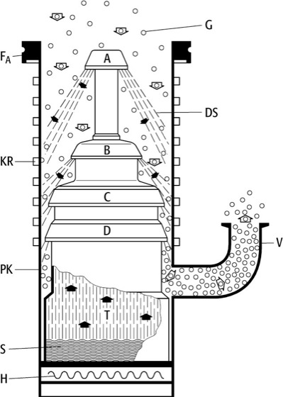 Diffusionspumpe: Arbeitsweise einer Diffusionspumpe: H: Heizung, S: Siederaum, PK: Pumpenkörper, KR: Kühlrohre, FA: Hochvakuumflansch, G: Gasmoleküle des abzupumpenden Gases, DS: Dampfstrahl, V: Vorvakuumstutzen, A,B,C,D: Düsen, T: Treibmitteldampf.