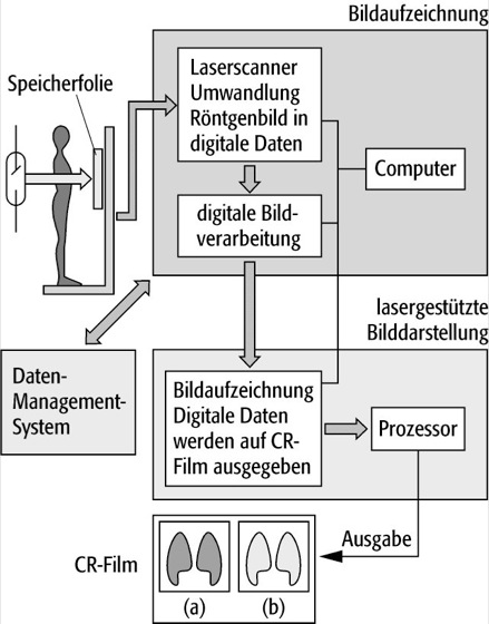 digitale Lumineszenz-Radiographie, in der Röntgendiagnostik verwendetes Bildauffangsystem, bei dem anstelle des Röntgenfilms in einer Röntgenkassette eine Speicherfolie (Lumineszenzfolie) als Aufnahmemedium dient. Durch die Röntgenstrahlung werden in den Kristallen der Folie Atome angeregt, indem Elektronen auf höhere Energieniveaus gebracht werden. Das Röntgenbild wird dabei durch die Verteilung der Elektronen auf die verschiedenen Energiezustände gespeichert. Zum Auslesen tastet man die Folie mit einem dünnen Laserstrahl zeilenweise ab. Die Elektronen fallen dadurch wieder in ihre ursprünglichen Energieniveaus zurück und emittieren Licht. Diese Bildinformation wird dann digital gewandelt und kann in einem Computer gespeichert bzw. weiterverarbeitet werden. Gleichmäßige Bestrahlung mit Laserlicht löscht die Information auf der Speicherfolie, so daß die Folie wiederverwendet werden kann.