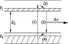 Diodenlaser 2: Laserniveauschema eines Diodenlasers mit vier Niveaus: Aus dem Valenzband angeregte Elektronen (1) fallen in die niedrigsten unbesetzten Zustände des Leitungsbandes (2), wonach die Rekombination aus dem Leitungs- in das Valenzband geschieht und ein Photon mit der Energie hν (h: Plancksche Konstante, ν: Frequenz) emittiert wird. Die Elektronen gehen zuletzt in die niedrigsten unbesetzten Zustände des Valenzbandes über (4).