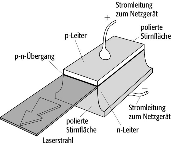 Der Aufbau eines einfachen Diodenlasers ist in Abb. 3 dargestellt. Meist sind beide Enden der Diode verspiegelt, so daß die Diode sowohl Lasermedium als auch -resonator ist und kein externer Resonator mehr benötigt wird.
