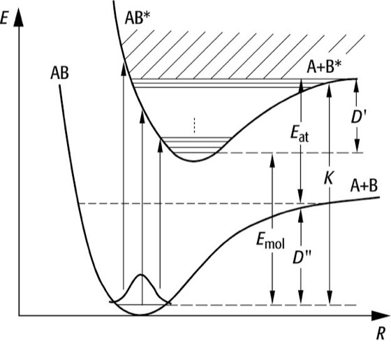 Dissoziationsenergie: Die Dissoziationsenergie D'' kleiner Moleküle AB im Grundzustand und D' in einem elektronischen Anregungszustand kann mit Hilfe der Konvergenzstelle im Bandenspektrum bestimmt werden. Dabei sind Eat bzw. Emol die Anregungsenergien der Atome bzw. Moleküle, die bei der Dissoziation entstehen.