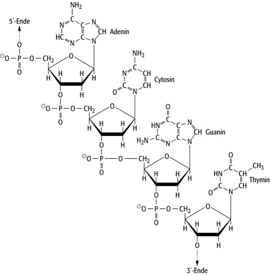Biologische Bedeutung: Die nichtzufällige Sequenz der Monomere im DNS-Kettenmolekül dient als Speicher der genetischen Information sowohl bei allen ein- und mehrzelligen Organismen als auch bei Viren (genetischer Code, Abb. 4). Einzige Ausnahme bilden sogenannte RNS-Viren und Phagen, in denen der Genom in Form der Nukleotidsequenz von RNS verschlüsselt ist. Dabei verfügt bei mehrzelligen Organismen jede Zelle zumindest im Anfangsstadium ihrer Entwicklung über einen kompletten Satz der gesamten genetischen Information des Organismus. Das Modell der doppelsträngigen DNS-Helix erklärt, wie die DNS ihre biologische Aufgabe wahrnehmen kann: Durch die Paarung komplementärer Stränge ist es DNS-Reparatursystemen in vivo möglich, einen einzelnen beschädigten Strang, z.B. infolge der Einwirkung von ionisierender Strahlung, durch Vergleich mit dem Partnerstrang zu identifizieren und wiederherzustellen. Damit ist eine gewisse Sicherheit bei der Informationsspeicherung über große Zeiträume gewährleistet. Andererseits kann jeder der Stränge als Matrix für die Synthese neuer DNS dienen (Replikation). Dabei entstehen zwei neue Doppelspiralen, jede mit einem alten und einem neuen Strang. Die identischen Kopien der genetische Information stehen dann bei Zellteilung (oder Virusvermehrung) den Tochterzellen (oder den neuen Viren) zur Verfügung. [FE]