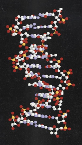 DNS 2: Ball-Balken-Darstellung der antiparallelen doppelsträngigen Helix in B-Form des selbstkomplementären Dodekamers CCGGAATTCCGG (Struktur 1BNA aus der Brookhaven Protein Data Bank). Man beachte die beiden verschieden großen, parallel zu den Zucker-Phosphat-Rückgraten (engl. backbone) verlaufenden Furchen, die als große bzw. kleine Furche bezeichnet werden. Durch diese sind die Nukleinsäurebasen trotz ihrer dichten Packung in erheblichem Maße für Liganden zugänglich. Damit ist das Abtasten der Basensequenz auch ohne Aufspaltung der Doppelhelix möglich. Das ist von großer Bedeutung für die Wechselwirkung mit regulatorischen Proteinen (Repressoren, Aktivatoren), RNS-Polymerasen und Reparaturenzymen.