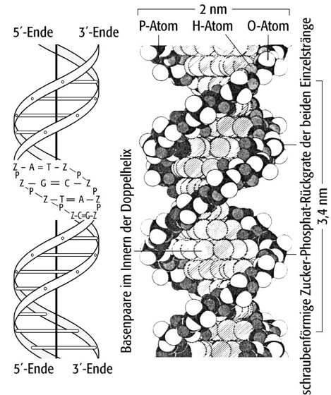 Ein DNS-Einzelstrang lagert sich beim Vorhandensein eines sogenannten komplementären DNS-Stranges an diesen an (Modell der doppelsträngigen Helix, Abb. 2 und 3). Der daraus entstehende Doppelstrang nimmt wegen des Kompromisses aus optimalem Stacking und möglichst geringer elektrostatischer Abstoßung der Phosphate eine Helixstruktur an. Die funktionellen Gruppen der Nukleinsäurebasen unterschiedlicher Stränge werden dabei mit Wasserstoffbrücken abgesättigt.