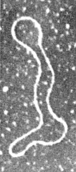 DNS 4: Elektronenmikroskopische Aufnahme des isolierten DNS-Moleküls des Bakteriophagen T2. Die Länge des Fadens beträgt 56 μm (etwa 180000 Basenpaare).