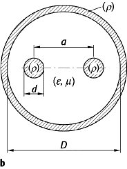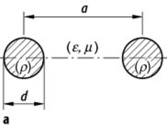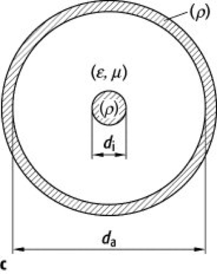 Doppelleitung: Querschnitte von Doppelleitungen mit spezifischem Widerstand ρ in einem Medium mit Dielektrizitätskonstante ε und Permeabilität μ: a) ungeschirmte Paralleldrahtleitung (Lecher-Leitung), d: Leiterdurchmesser, a: Leiterabstand; b) geschirmte Paralleldrahtleitung, d: Leiterdurchmesser, a: Leiterabstand, D: Innendurchmesser der Abschirmung; c) Koaxialleitung, di: Innen-, da: Außenleiterdurchmesser.