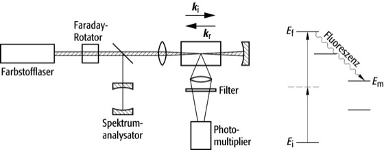 wobei ω1 und ω2 bzw. k1 und k2 die Kreisfrequenzen bzw. die Wellenvektoren der beiden Photonen sind. Für kollinear gegenläufige Photonen der gleichen Frequenz wird der zweite Term null, da k1 = – k2, und die Resonanzbedingung wird unabhängig von der Geschwindigkeit der Atome. Das bedeutet, die Doppler-Verbreiterung wird ausgeschaltet, es nehmen aber alle Atome an der Absorption teil. Die Anordnung eines solchen Experiments ist in der Abb. dargestellt. Ein durchstimmbarer Laser wird in eine Absorptionszelle fokussiert und der Strahl mit einem sphärischen Spiegel in sich zurückreflektiert. Die Anregung wird durch die Fluoreszenz nachgewiesen, die meist kurzwelliger ist. Diese Methode ist eine Möglichkeit zur Ausschaltung des Problems der Doppler-Verbreiterung.